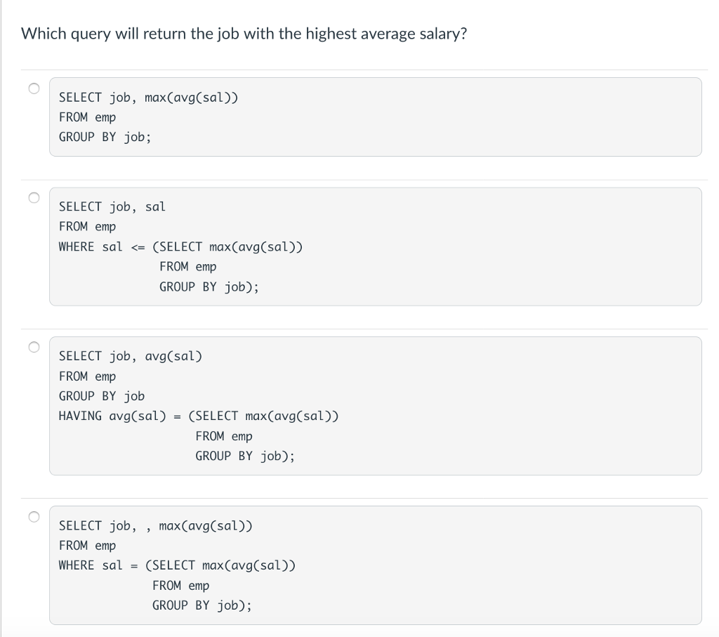 In this example when the query is executed the subquery runs first and returns all office codes of the offices located in the USA. D Question 7 The following SQL statement contains what type of subqueries. So a scalar subquery can replace a constant such as 1 or abc or current_date.